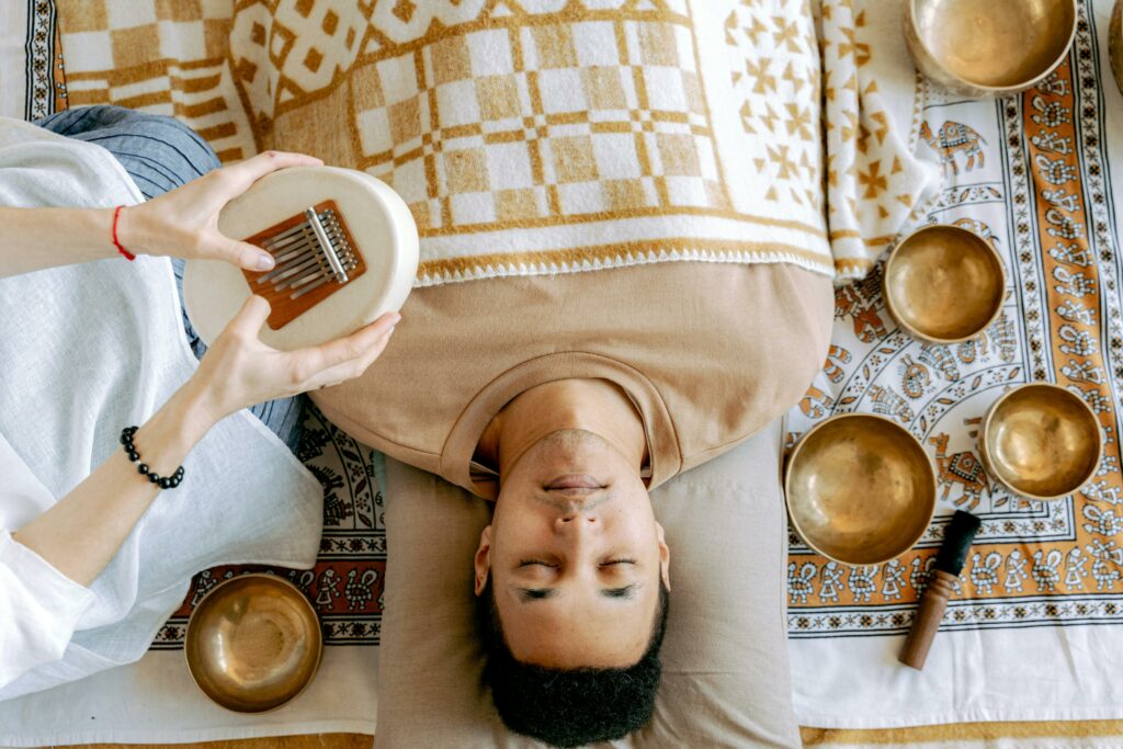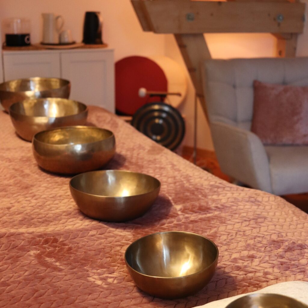 Parfois, j’invite à un court exercice respiratoire ou corporel pour aider le corps à changer de rythme. Ensuite, vous vous allongez. Les sons enveloppent le corps : bols, tambour, carillons, gongs, voix. Les vibrations apaisent le système nerveux, relâchent les tensions et soutiennent un meilleur sommeil.